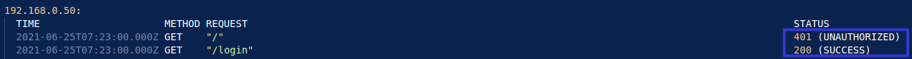 Utilising IP address 192.168.0.50 as an initial reference point, it is clear that each user must log into the dashboard with authorised credentials, which then allows them access to the dashboard. I can observe the primary GET request, with the status assigned as 401 (UNAUTHORIZED), however, once the correct credentials have been provided, the user successfully logs in. This is denoted by the new 200 (SUCCESS) status.