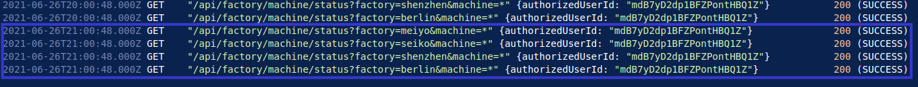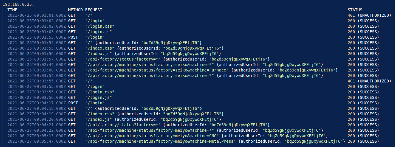 In this example, 192.168.0.25 logs in with their credentials, obtaining the user ID bqZd59gNjgDxywqXFEtjT6. This user makes multiple API requests to the dashboard, requesting the status of the Seiko plant and machines at this plant. This user returns at 9:03:55AM on the 27th, and is required to log-in again, as their credentials have now expired. Once this is validated, the user then proceeds to make more API requests on more machines at the Meiyo plant.