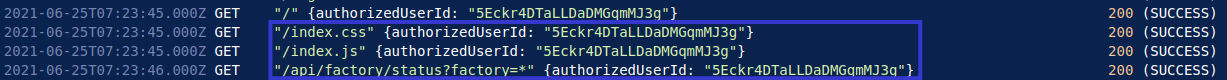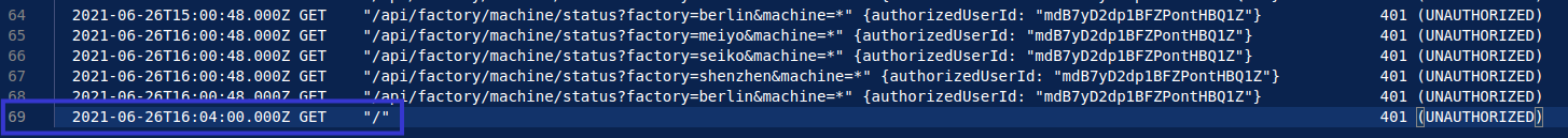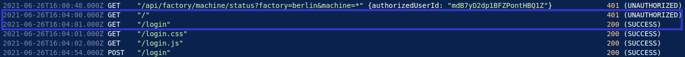 When examining the pattern of behaviour from a regular employee, it is evident that each user typically logs in using their credentials, subsequently being assigned an authorised ID. They then access the dashboard and execute multiple API calls to obtain the status of specific machines or plants. In the below example, we can see that IP address 192.168.0.38 logs in, and obtains the user ID irHRppZK35peUiTjxPuCdL. This user then requests the status of the Seiko plant, and the Laser Welder machine at the Seiko plant. This is the last request from this user.