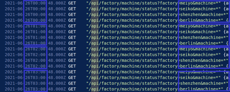 When analysing logs for automated requests, I often find the timestamps of the logs to be the most telling. Using this approach, it is clear that for each of the four plants owned by Daikibo, an API request was made for the status of each, every hour, on the hour from the IP address 192.168.0.101.